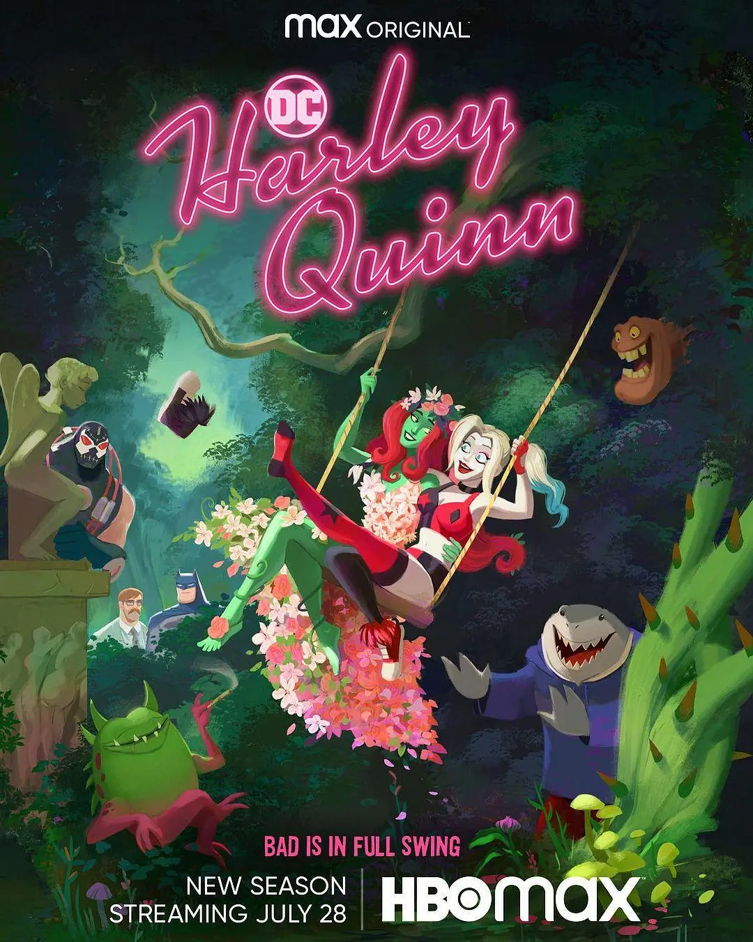 这部辛辣而又热闹的成人动画喜剧系列的第三季继续上演着混乱和疯狂。哈莉·奎茵 (Kaley Cuoco) 和毒藤女 (Lake Bell) 结束了他们的“吃。砰!杀。巡演”,作为 DC 反派界的新势力夫妇,重返哥谭。与他们的杂牌帮派——鲨鱼王 (Ron Funches)、泥脸 (Alan Tudyk)、植物弗兰克 (JB Smoove) 一起,“哈莉”努力成为最好的自己,同时也努力实现毒藤女长期以来的计划,即将哥谭变成伊甸园天堂。